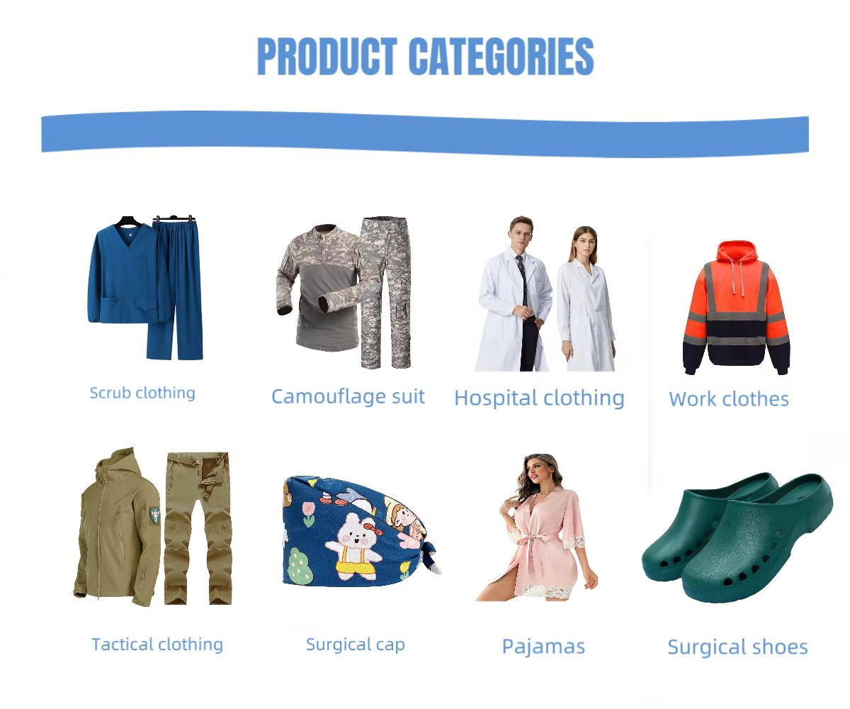 المنتجات الرئيسيةزي المستشفى ، ملابس العمل ، الملابس التكتيكية ، ملابس مكافحة الحرائق ، السراويل